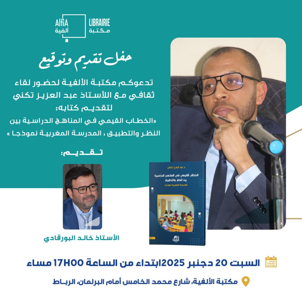 تحضتن مكتبة الألفية بالرباط يوم السبت 20 دجنبر 2025 ابتداء من الساعة 17:00 مساء، حفل تقديم وتوقيع كتاب: “الخطاب القيمي في المناهج الدراسية بين النظر والتطبيق، المدرسة المغربية نموذجا“، للدكتور عبد العزيز تكني، ويقدم الكتاب الخبير التربوي الدكتور خالد البورقادي.