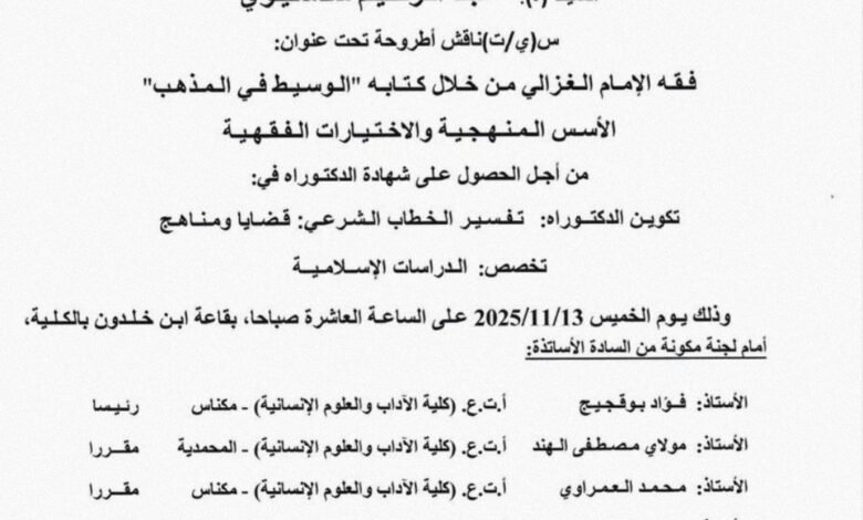 أطروحة للدكتوراه في مكناس تناقش فقه الإمام الغزالي من خلال كتابه الوسيط في المذهب