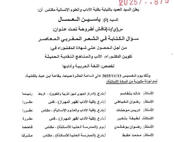 يناقش الباحث ياسين العسال أطروحته للدكتوراه، في موضوع: سؤال الكتابة في الشعر المغربي المعاصر وذلك ضمن تكوين الدكتوراه: الأدب والمناهج النقدية الحديثة، تخصص اللغة العربية وآدابها، وستجري أطوار المناقشة بتاريخ: الخميس 13 نونبر 2025 على الساعة العاشرة صباحا، بقاعة ابن عباد، بكلية الآداب والعلوم الإنسانية مكناس. وتتكون لجنة المناقشة من السادة الأساتذة: الأستاذ خالد بلقاسم رئيسا الأستاذ رضوان الخياطي مقررا…