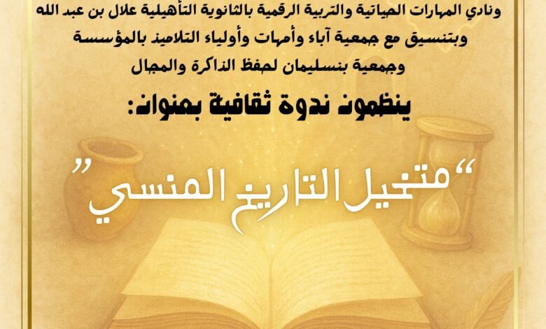 أحلاف: 02 دجنبر 2025 متابعة زكرياء عريف حرصا على تعزيز الوعي بالذاكرة التاريخية لدى الناشئة والمهتمين، وإبراز دور المتخيل الأدبي في إحياء الذاكرة المحلية والوطنية، نظم مختبر السرديات والخطابات الثقافية بكلية الآداب بنمسيك، بتنسيق مع نادي المهارات الحياتية والتربية الرقمية بالثانوية التأهيلية علال بن عبد الله، أحلاف – بنسليمان – وجمعية آباء وأمهات وأولياء التلاميذ بالمؤسسة، وجمعية بنسليمان لحفظ الذاكرة…