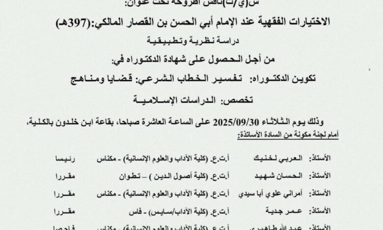 دكتوراه في مكناس تناقش الاختيارات الفقهية عند الإمام أبي الحسن بن القصار المالكي(397ه)